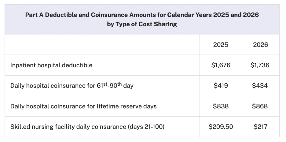 - Part B deductible Increased $26 from $257 in 2025 to $283 in 2026.